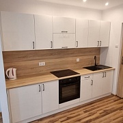 Kuchnia , zabudowana i wyposażona z oknem i widokiem na zieleń.