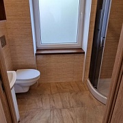 W łazience kabina prysznicowa, na ścianach i podłodze płytki