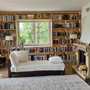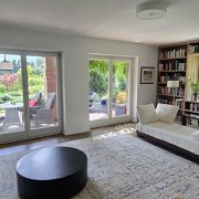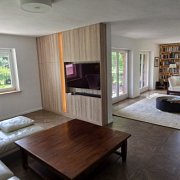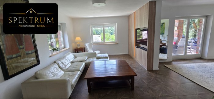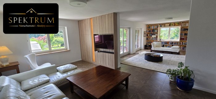 przestronny ok  50 m salon z biblioteką i kominkiem, doświetlony od  strony wschodniej , południowej i  zachodniej  pięcioma oknami, w tym dwoma oknami  tarasowymi z widokiem na  rozpościerającą  się zieleń,