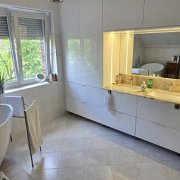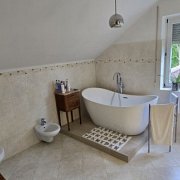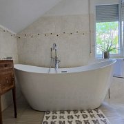 pokój kąpielowy z wygodną, klimatyczną wanną oraz prysznicem , zabudowany  eleganckimi, białymi meblami łazienkowym wykonanymi na zamówienie .